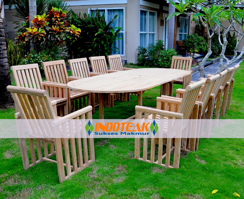 We offer the oval double leaf table ( double extending table) sets with teak chair fixed. This designs is strong and durable. We used the high quality wooden material from teak wood Indonesia.